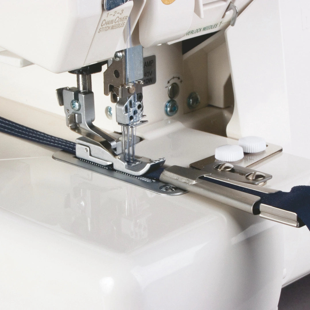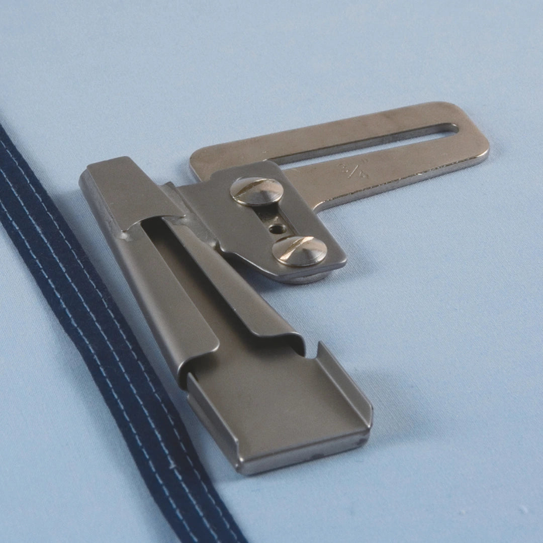 Ce plieur replie les deux bords d’une bande de tissu de manière régulière, avant de la coudre avec un point de recouvrement large. Le résultat : une bande nette et uniforme, idéale non seulement pour les passants de ceinture, mais aussi pour les bretelles, anses ou poignées.