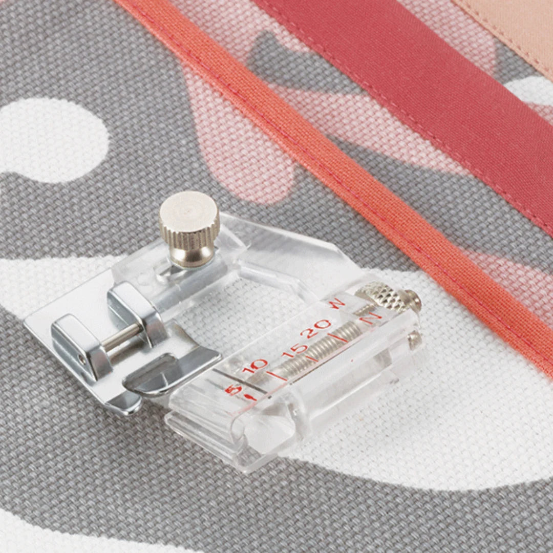 Posez vos biais avec précision ! Ce guide transparent s’ajuste pour coudre des biais de 5 à 20 mm en toute facilité.