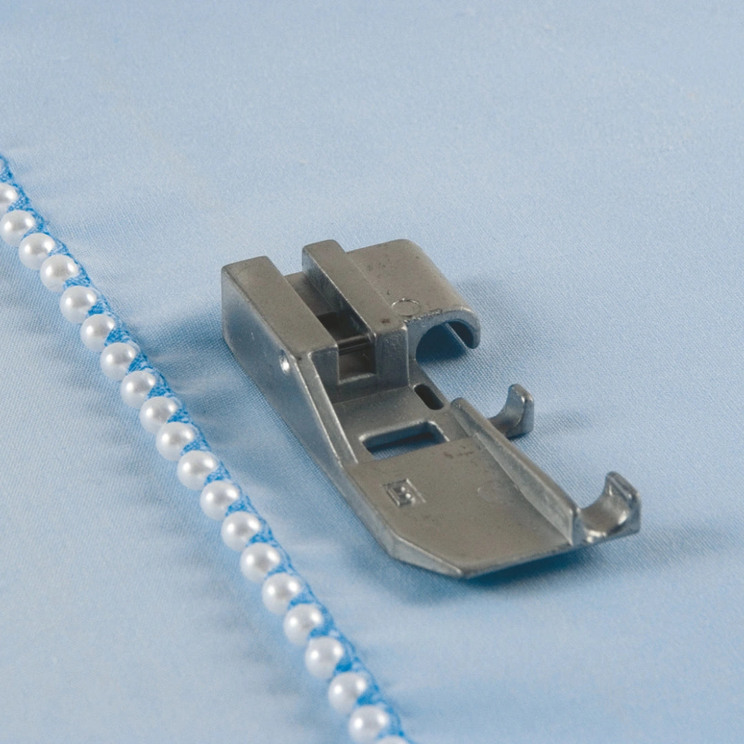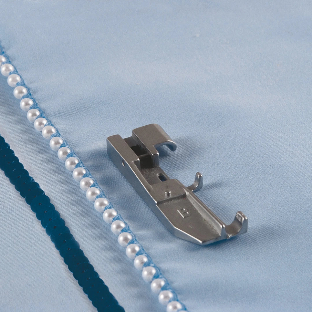 Le pied pour perles et paillettes est l’accessoire idéal pour sublimer vos ouvrages avec élégance. Il permet de coudre facilement des perles (jusqu’à 4 mm de diamètre), des paillettes, du ruban de plomb ou encore des cordons décoratifs, que ce soit sur les bords ou au centre du tissu. Un indispensable pour ajouter du relief, de la brillance et du style à vos projets couture.
