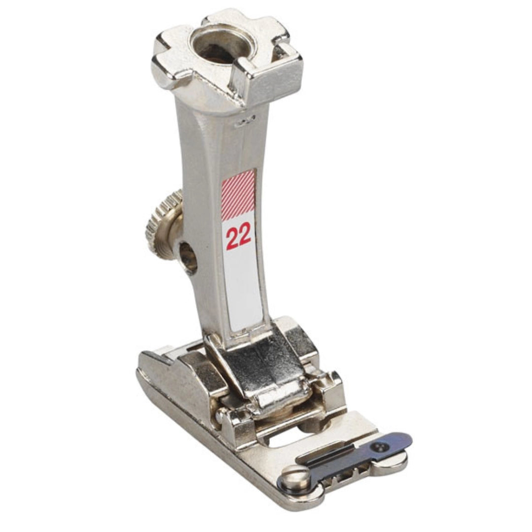 Les rainures permettent de coudre simultanément plusieurs fils ou rubans fins en parallèle qui sont fermement maintenus en place par le rabat. Guider le fil devient donc superflu. Le pied # 22 est conçu pour trois fils en parallèle, et le pied # 25 pour cinq fils.