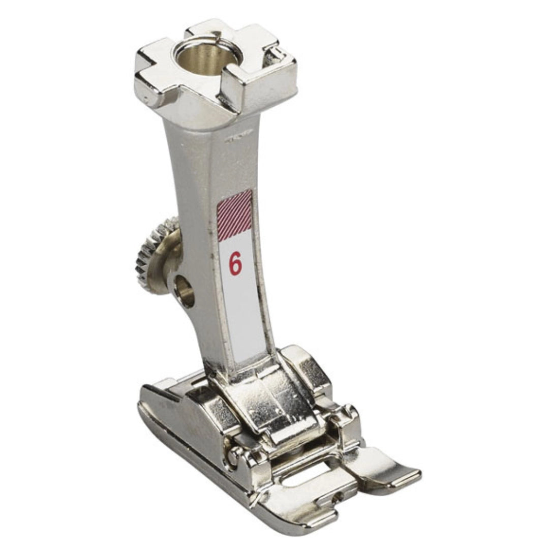 Ce pied est idéal pour les coutures chenilles, les appliqués et les points décoratifs. La couture à l‘aide d‘un fil décoratif crée de beaux effets. Le petit espace au milieu de l‘avant du pied permet de glisser un fil d‘accompagnement ou un fil élastique. Il peut également servir de ligne de support optique.