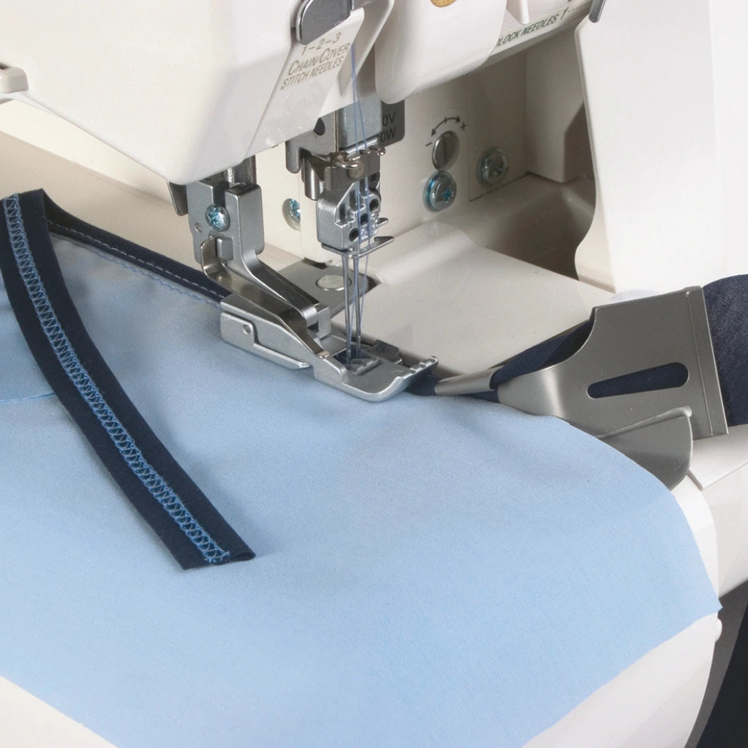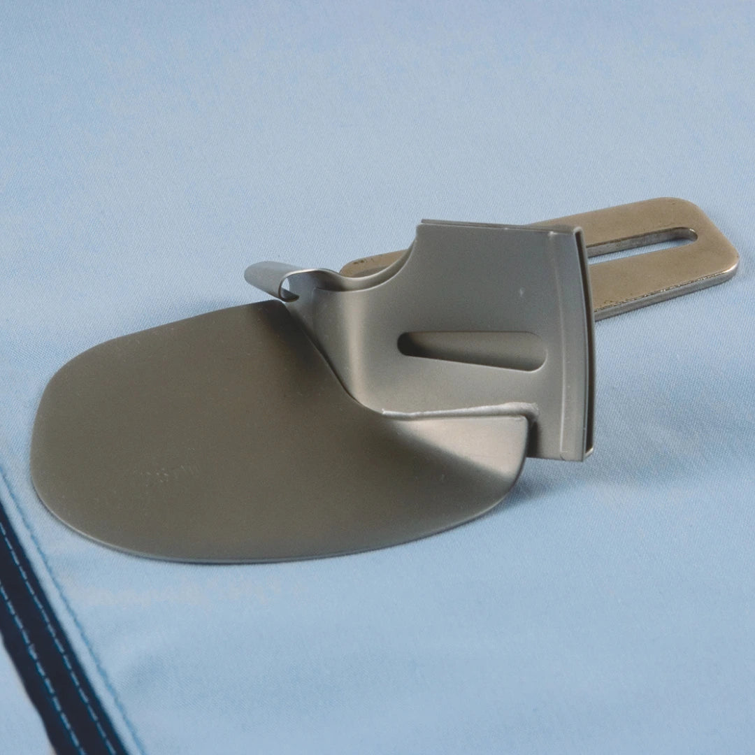 Le pose-biais pli unique est un accessoire conçu pour appliquer rapidement et avec une grande précision un biais sur les bords de tissu ou les encolures. Il permet une couture au point de recouvrement ou au point de chaînette double. Le biais est replié deux fois sur le dessus pour un fini net, tandis que l’envers reste ouvert.