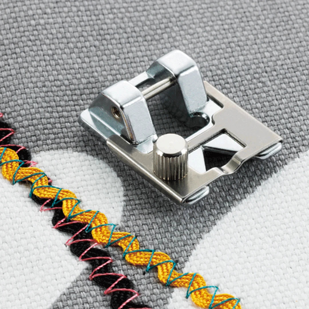 Cousez facilement rubans, tresses et cordons ! Son guide réglable centre parfaitement vos décos jusqu’à 7 mm de large.