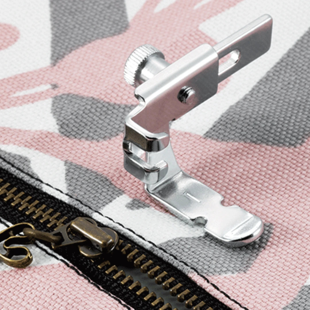 Fermetures et passepoils sans accroc ! Ce pied ajustable se positionne au plus près pour une couture nette et précise.