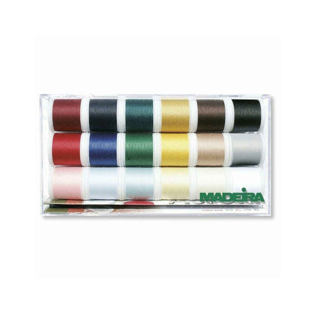 Ce coffret contient 18 bobines de fil 100 % polyester Madeira, reconnues pour leur solidité, leur régularité et leur polyvalence. Idéal pour tous types de couture, il offre confort et précision pour vos projets quotidiens ou créatifs.