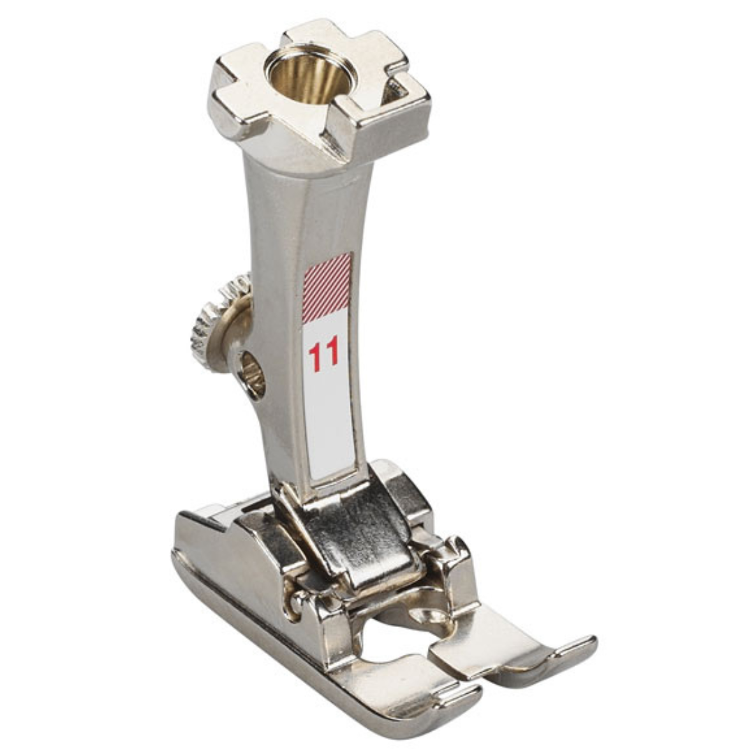 Ce pied-de-biche s‘utilise pour la couture et la surpiqûre avec un cordon en fil supérieur ainsi que pour les motifs Sashiko et autres. La rainure de 2 mm de profondeur garantit un avancement régulier du tissu.