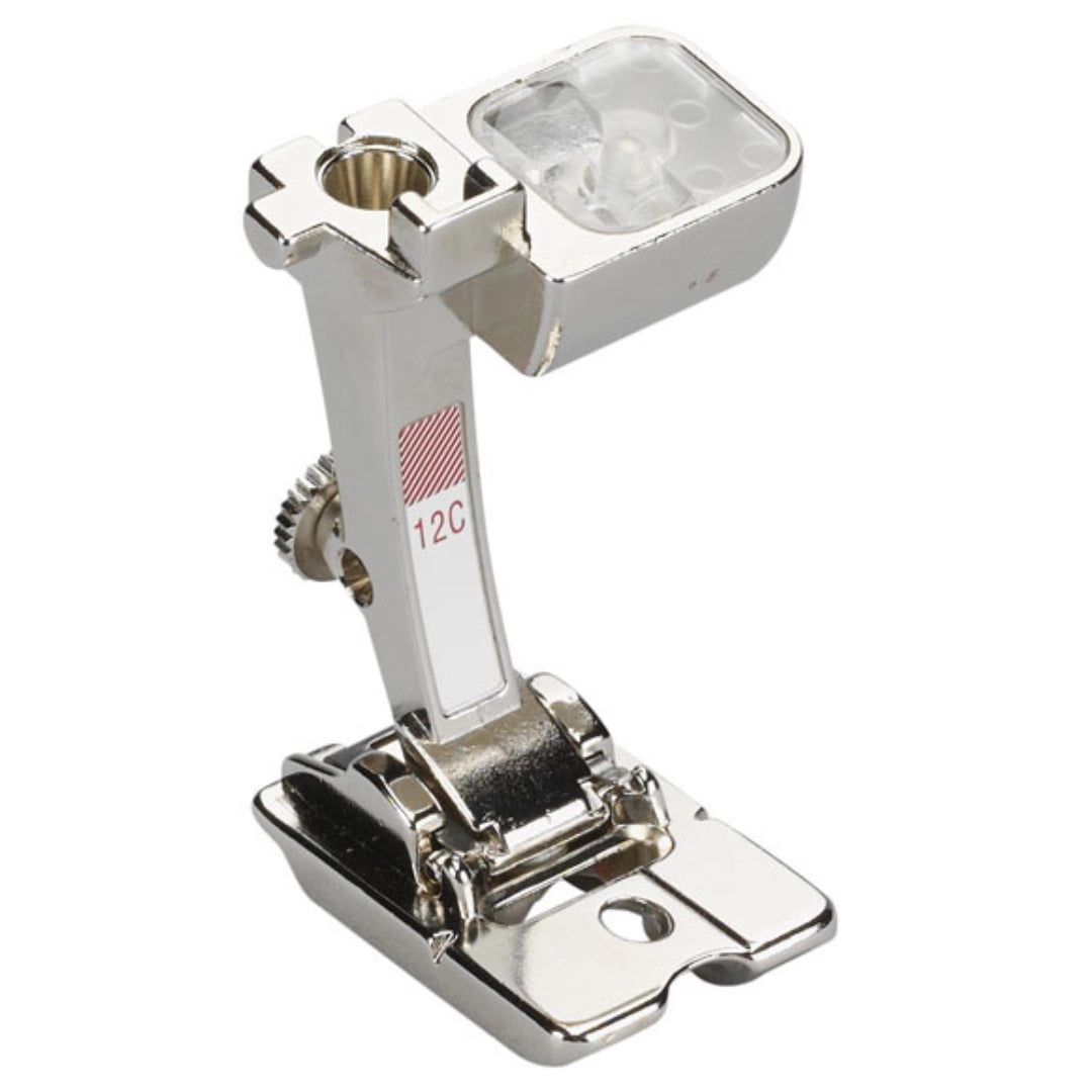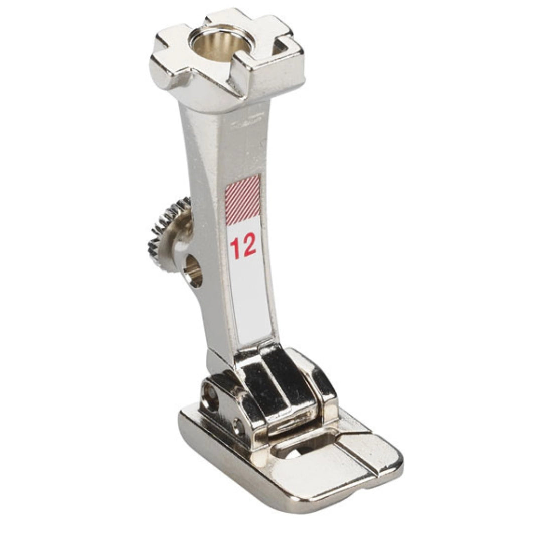 Pour l‘assemblage de tricots, la couture d‘épais cordons, de fils de perles et de paillettes, ou pour la confection de passepoil en un seul passage. Avec une largeur de point maximale de 9 mm, le pied # 12C est équipé en plus d‘un espace guide ouvert pour la surpiqûre de fils d‘accompagnement comme de la laine, du fil de coton et des bandes de cuir.