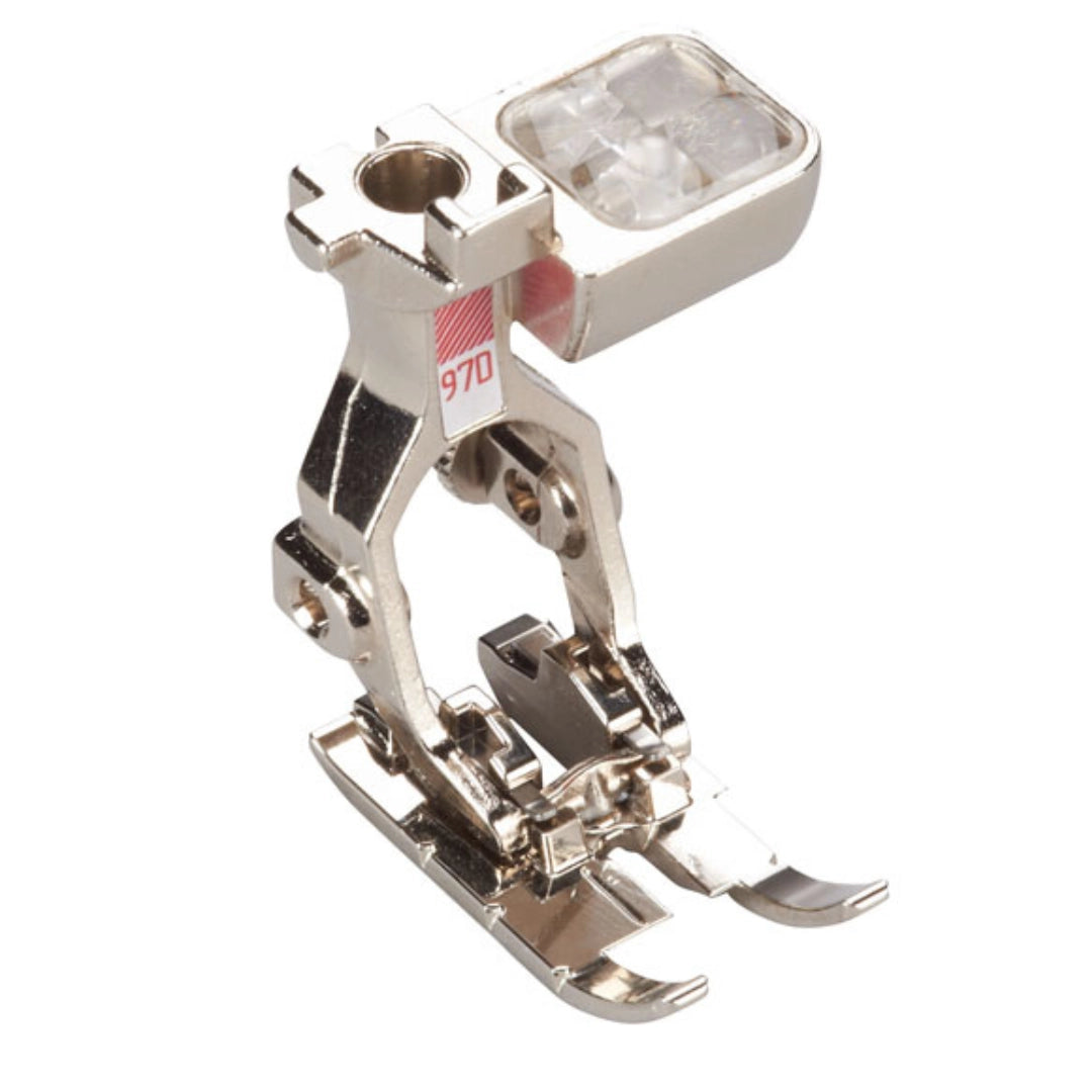 Le pied pour patchwork permet de réaliser de magnifiques quilts et des ouvrages de grande précision. Les repères des surplus de 3 mm (1/8 pouce), de 6 mm (¼ pouce) et de 7,5 mm placés sur la semelle du pied servent de guide. Sa surface de contact est idéale pour des machines ayant une largeur de point de 9 mm. Elle permet un guidage minutieux de l‘ouvrage et du point lors de l‘assemblage de pièces de tissu.